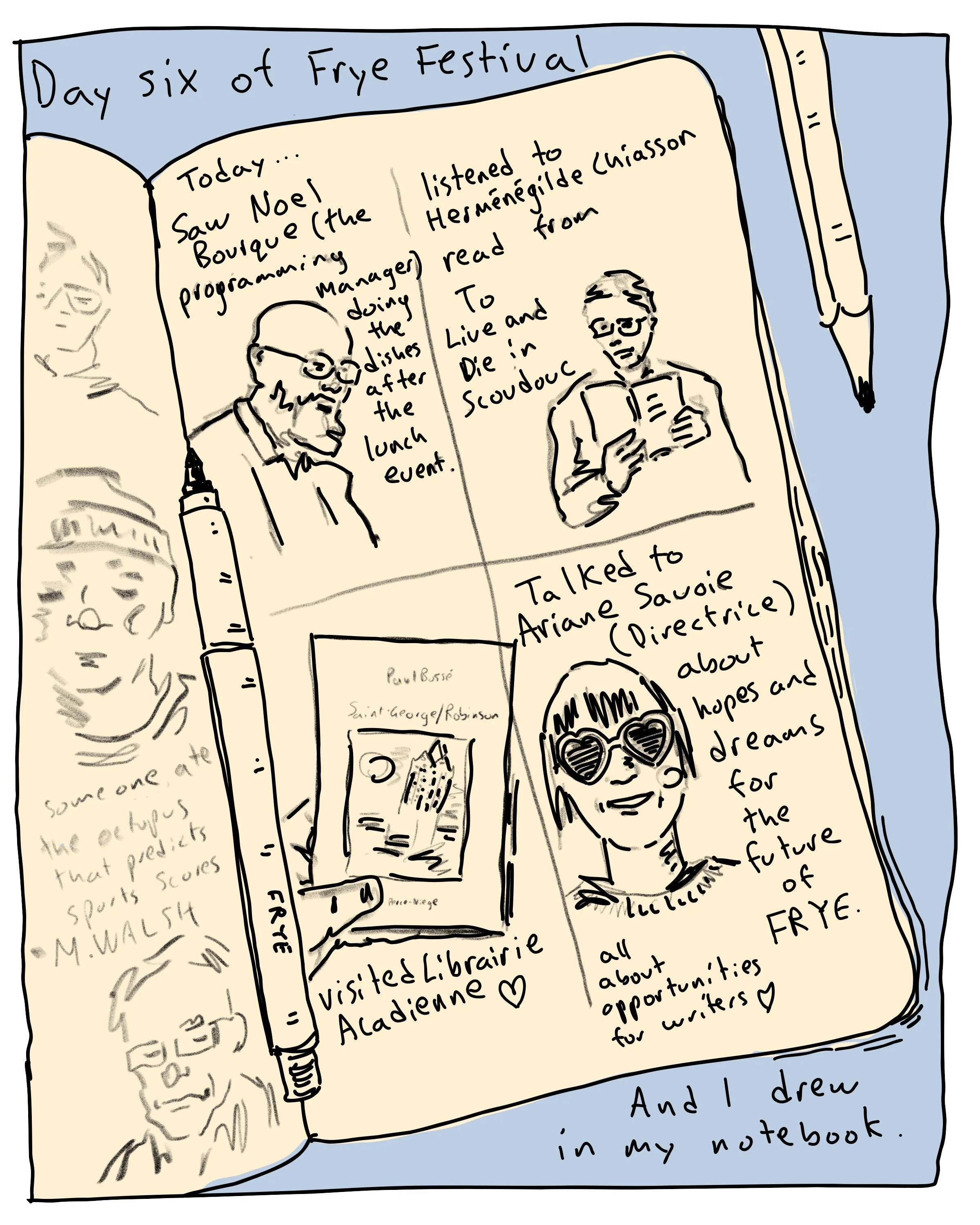 In 2024, the Frye Festival, a literary festival in Moncton, New Brunswick, invited me to be a Frye Correspondent. Every day of the festival, I wrote a comic recapping my experiences and posted drawings of all the events I attended. It was a dream job, and I’d love to do it again at another festival or event.